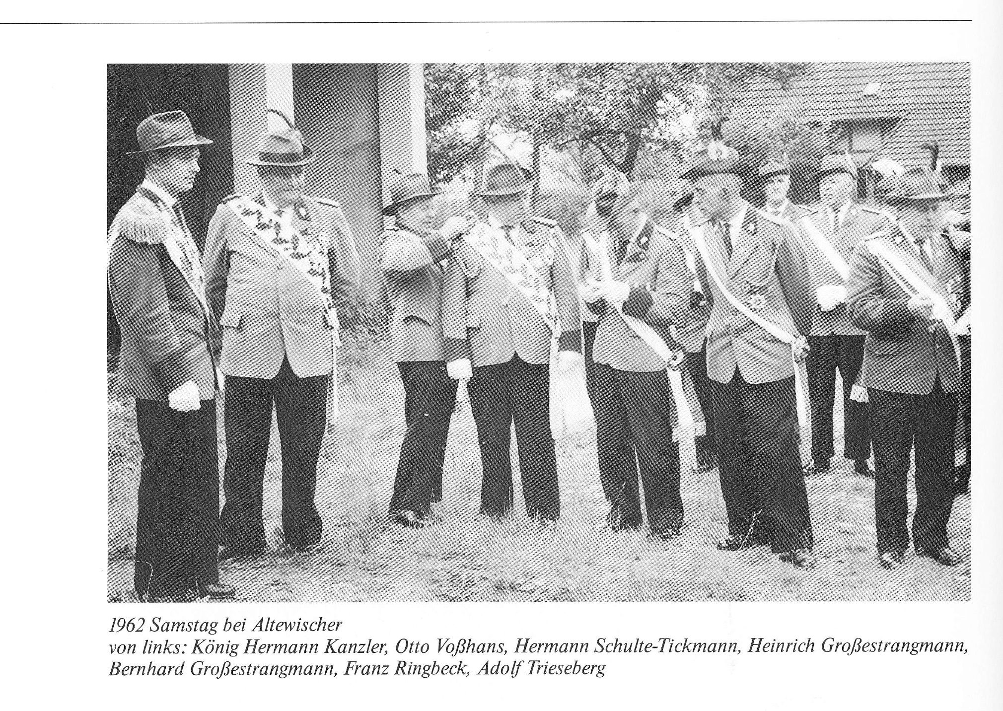 Heuerlingshäuser waren zu damaliger Zeit Nebengebäude der Hofstelle. Die dort lebenden Bauern, die Heuerlinge, waren keine vollberechtigten Mitglieder der Bauernschaft. Auch auf unserem jetzigen Areal der Stiftung Altewischer gab es damals wohl mehrere Heuerlingshäuser. Sicher bekannt ist uns das Heuerlingshaus unten links auf dem Foto. Dieses stand an der Stelle des jetzigen Biergartens der Gaststätte „Le Stelle“. Das Gebäude wurde auf Grund der schlecht erhaltenen Bausubstanz im Jahre 1963 abgerissen. Ein weiteres Foto ist vom Schützenfest der St. Sebastianer Schützenbruderschaft aus dem Jahre 1962 (Foto unten Rechts). Beim damaligen Antreten entstand das Foto. Im Hintergrund sieht man die Seitenansicht des Heuerlingshauses mit der Fachwerkoptik.