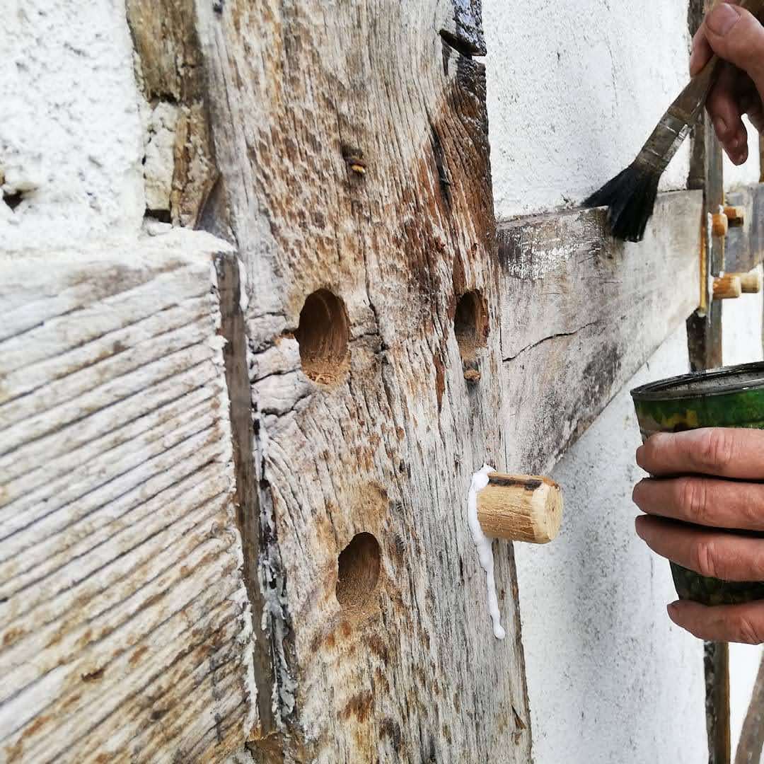 Während der Renovierungsarbeiten an unserem schönen westfälischen Vierständerhaus sind uns unterschiedliche Verzapfungen der Eichenbalken aufgefallen. Es stellte sich heraus, das das ursprüngliche Bauernhaus um 14 Meter verlängert worden ist. Dazu ist der heutige Nordgiebel komplett demontiert, der Bereich der Deele dann verlängert und anschließend der Nordgiebel wieder an seinem ursprünglichen Platz moniert worden. Der Zeitpunkt muss auf jeden Fall nach 1820 erfolgt sein. Ersichtlich ist der Anbau anhand der Verbindungen der Eichenbalken. Der Anbau ist mit einer „2-Zapf-Technik“ ausgeführt worden. Das alte Bauernhaus und der originale Nordgiebel wurden in der früheren „4-Zapf-Technik“ ausgeführt.